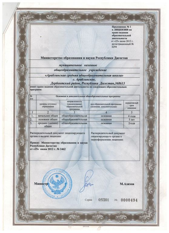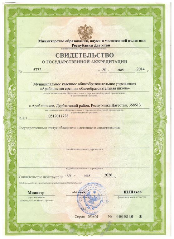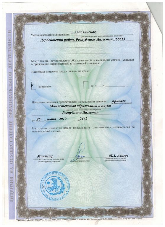 | Адрес местонахождения образовательной организации* | 368613, Республика Дагестан, Дербентский район, село Араблинское |